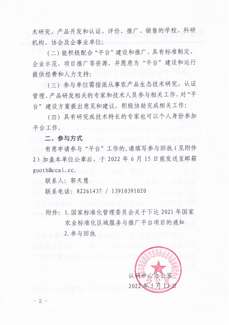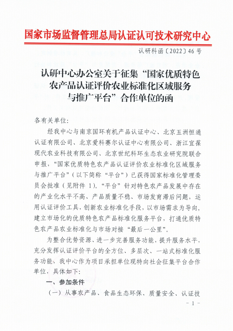 認(rèn)研科函2022年第46號(hào)-認(rèn)研中心辦公室關(guān)于征集“國家優(yōu)質(zhì)特色農(nóng)產(chǎn)品認(rèn)證評(píng)價(jià)農(nóng)業(yè)標(biāo)準(zhǔn)化區(qū)域服務(wù)與推廣平臺(tái)”合作單位的函